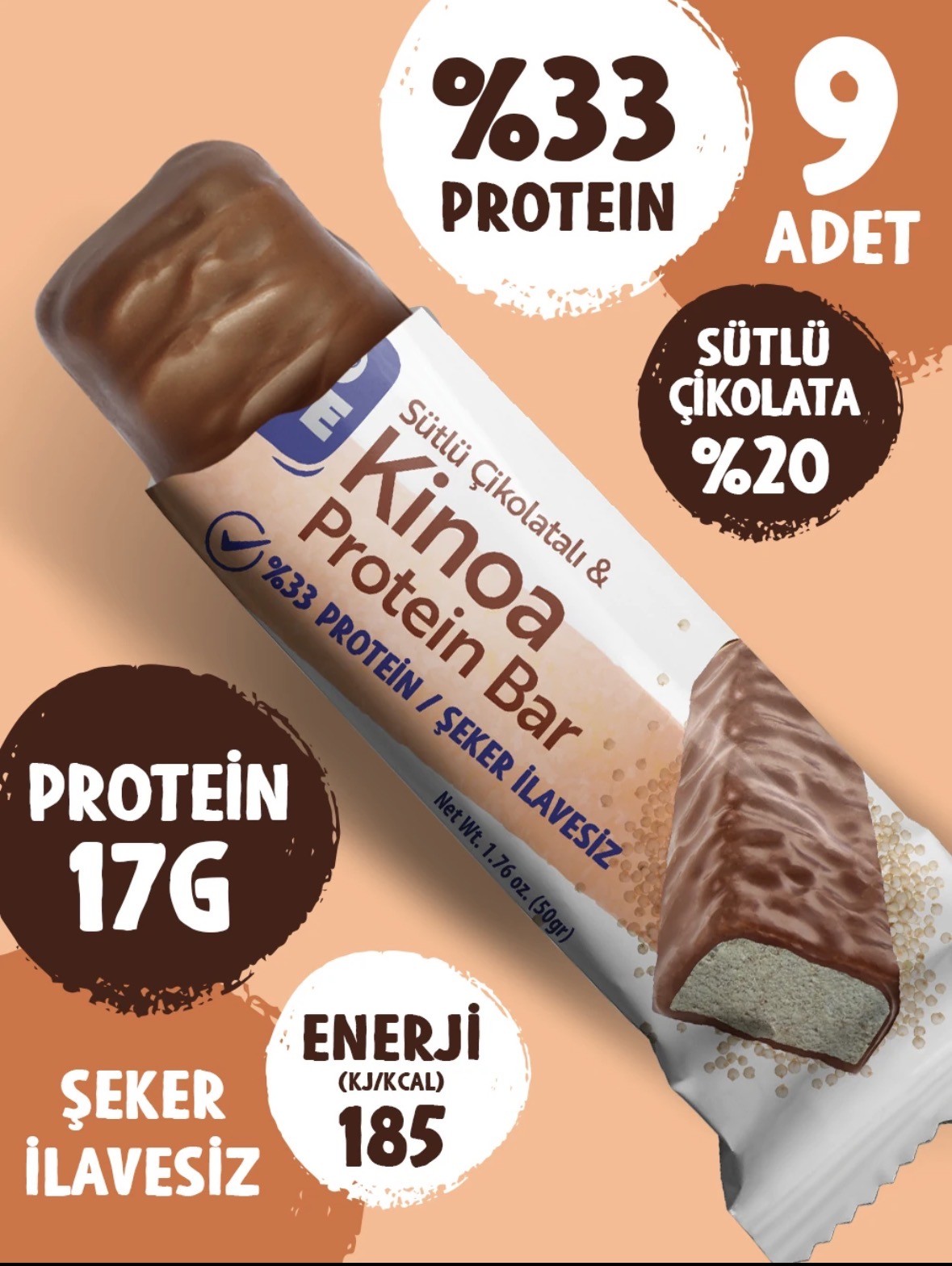 Besleyici kinoayla güçlendirilmiş, çikolatalı ve %33 proteinli bar, şeker ilavesiz ve lif kaynağıdır. Türkiye'de ilk