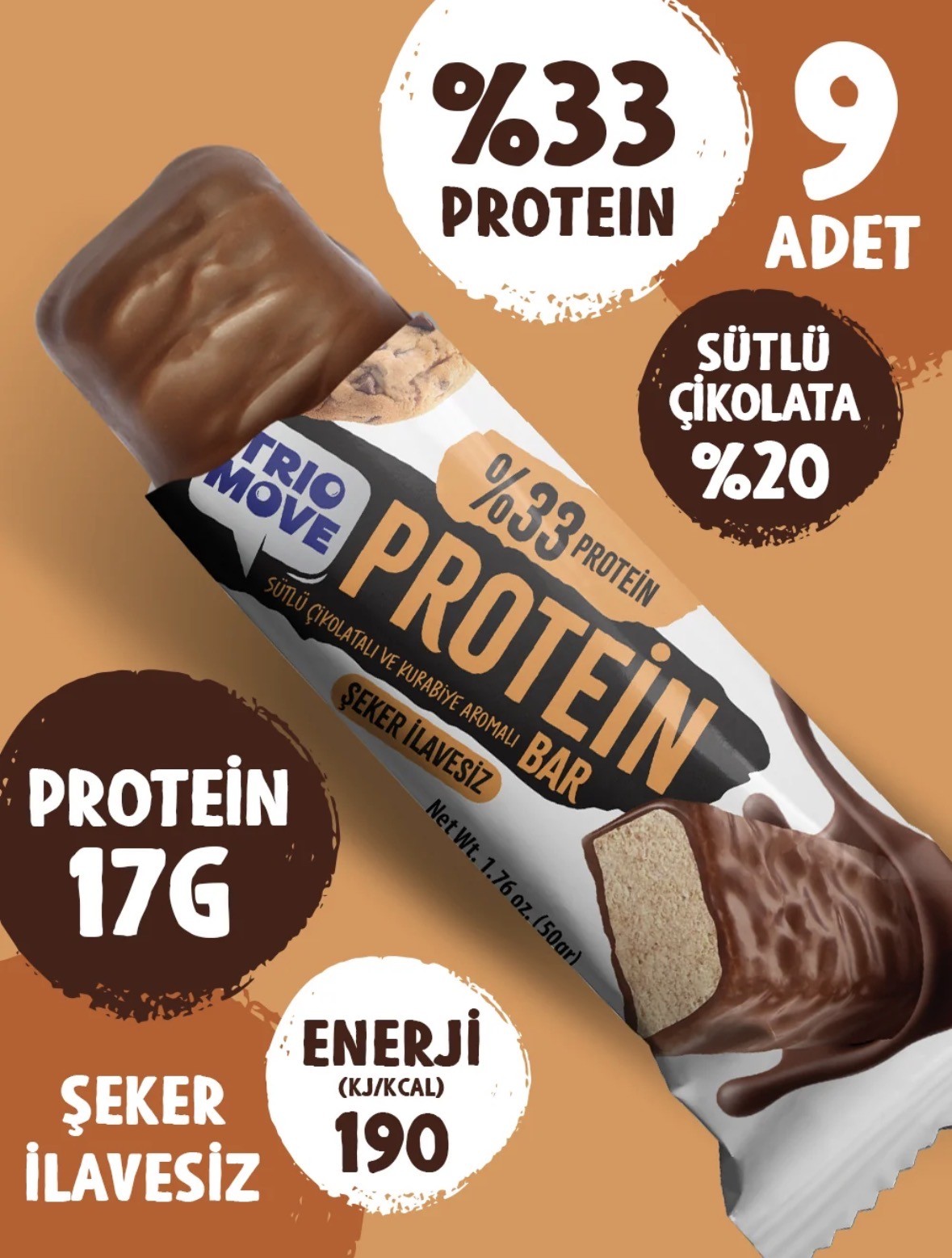 Trio Çikolata Kaplamalı Protein Bar - Kurabiyeli ve Sütlü Çikolatalı, %33 Protein, 50 g x 9 Adet Bilgileri