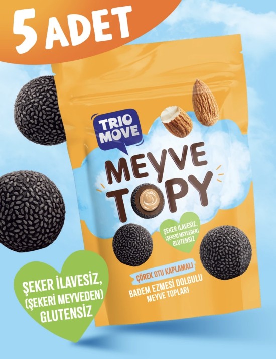 Trio Move Meyve Topy Bademli, badem ezmesi dolgusu ve çörek otu kaplamasıyla hazırlanmış, doğal içeriğiyle öne çıkan pratik ve lezzetli bir atıştırmalıktır. İlave şeker içermez, şekerini yalnızca meyveden alır ve glutensiz yapısıyla sağlıklı beslenmeyi tercih edenler için ideal bir alternatiftir.